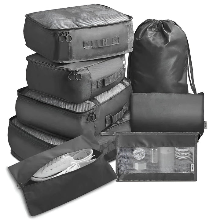 COMPLETE TRAVEL SET: Seven specialized bags include three clothing cubes, toiletry bag, shoe compartment, and multipurpose pouches.