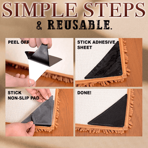 Rug Gripper's are the easiest way to keep your mats and area rugs secure even during vacuuming. Prevents slips and trips on area rugs and keep your rugs looking neat and tidy! Just press unto each carpet's corner and your set. Rug Grippers are also reusable and won't leave a residue. Just wash with soap and water and reuse!